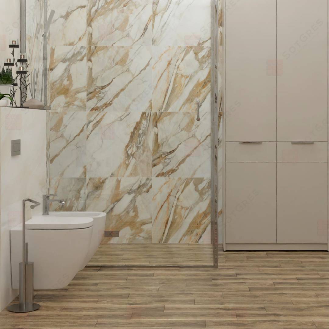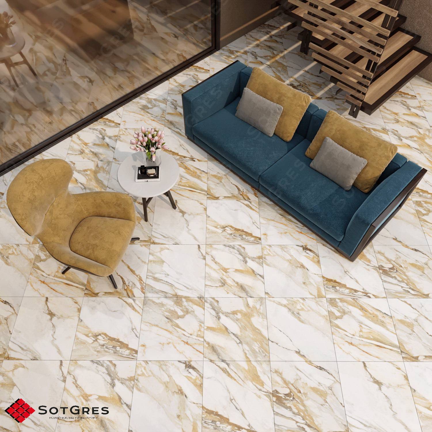 Купить керамогранит желтый с коричневым под мрамор 60x60, толщина 9 мм, 1,44м2. CALCATTA GOLD BORGHINI глянцевый керамогранит в Краснодаре
