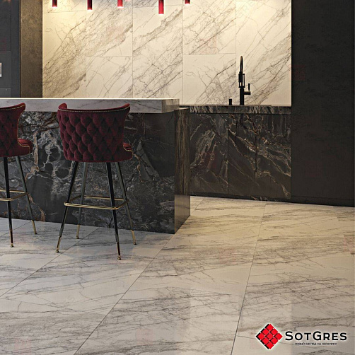 Купить керамогранит белый под мрамор с зеркальной поверхность 120x60, толщина 9 мм, 1,44м2. STORMS WHITE глянцевый керамогранит в Краснодаре