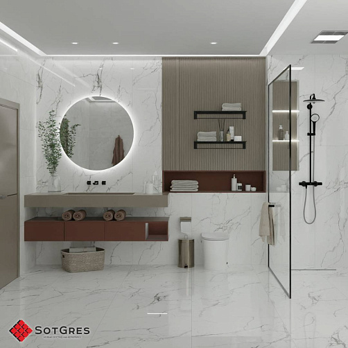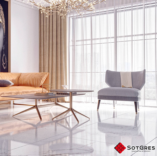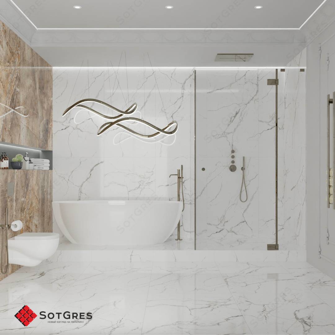 Купить крупноформатный керамогранит глянцевый 160x80, толщина 9 мм REGAL CARARRA WHITE белый под мрамор глянцевый с двойной полировкой в Краснодаре
