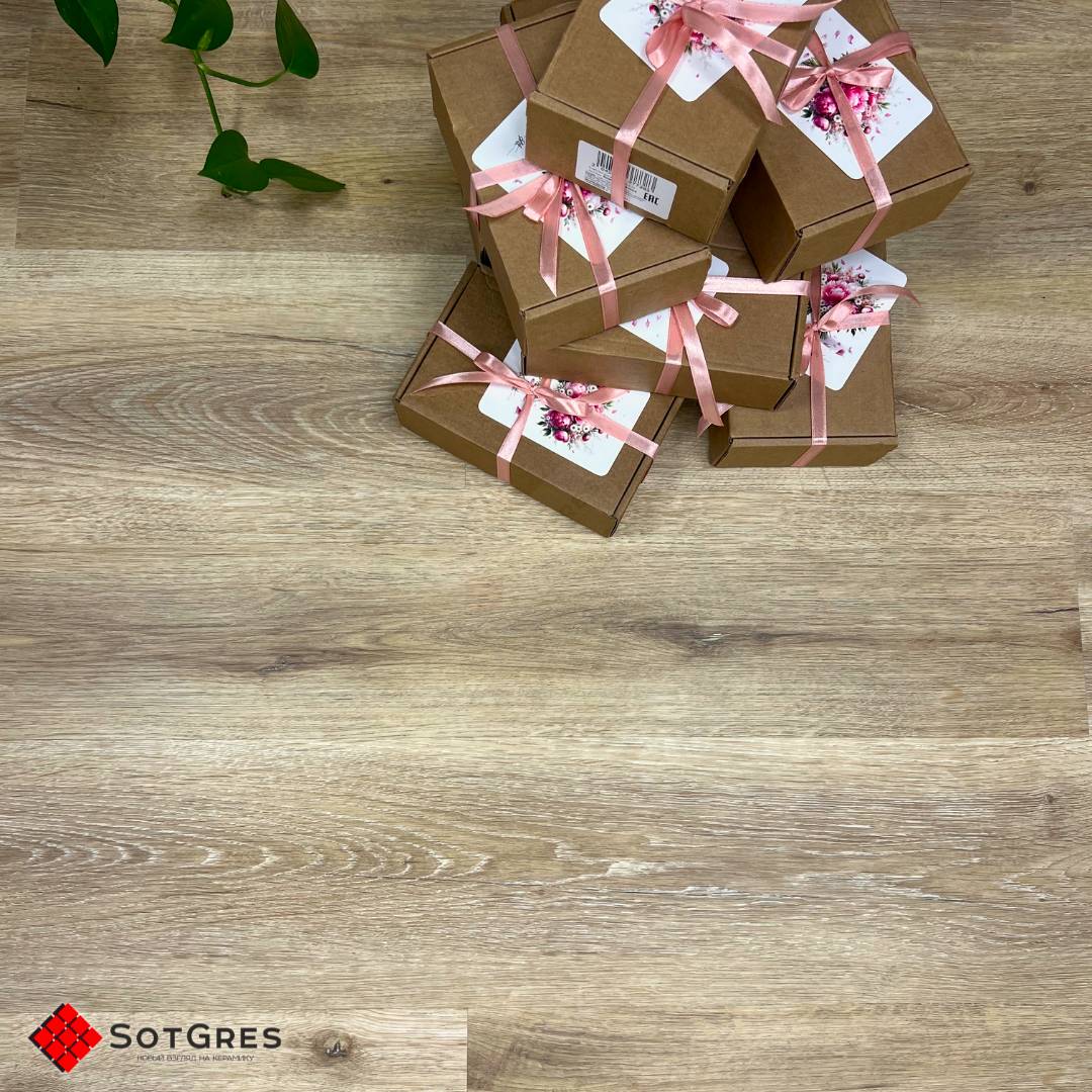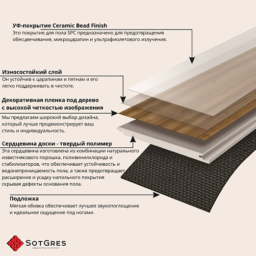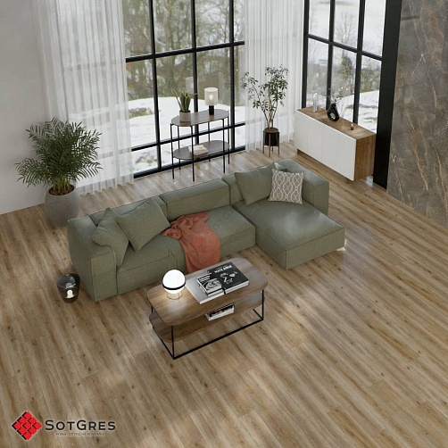 Купить золотисто-бежевое напольное покрытие SPC, кварцвинил, плитка SPC в Краснодаре. 34 класс износостойкости, замковая укладка. Толщина: 4 мм + 1 мм подложка.