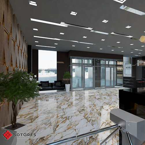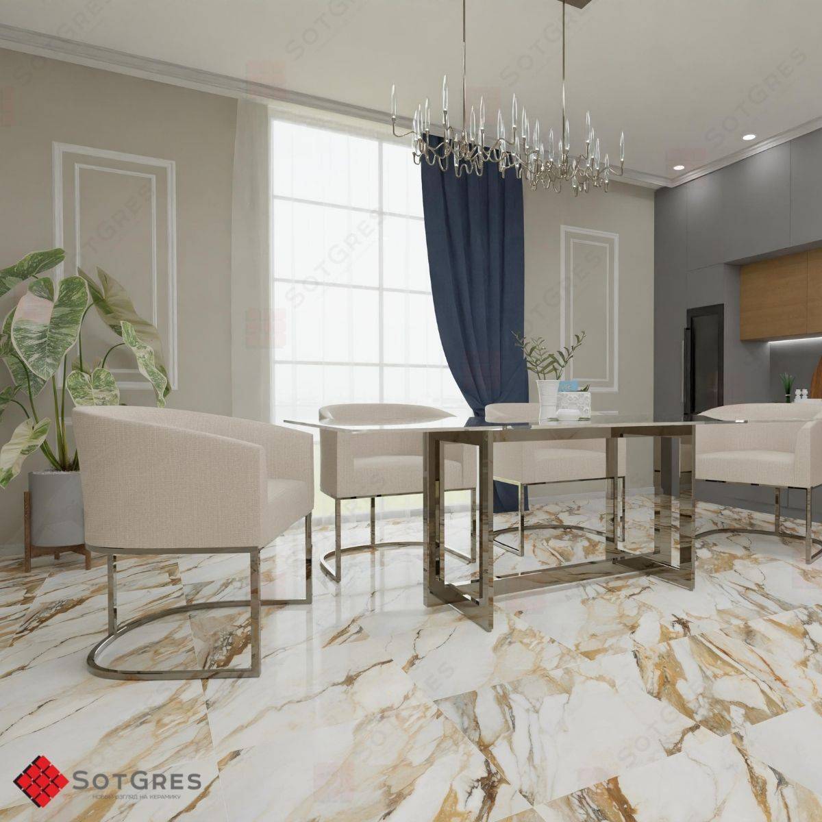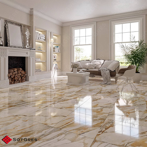 Купить керамогранит желтый с коричневым под мрамор 60x60, толщина 9 мм, 1,44м2. CALCATTA GOLD BORGHINI глянцевый керамогранит в Краснодаре